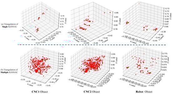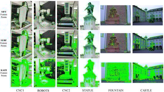 The positional distribution of feature points obtained using SIFT, SURF, and KAZE descriptors is shown in Figure 12. It is evident that the KAZE feature descriptor detected significantly more feature points compared to SIFT and SURF. The dense distribution of KAZE feature points across all datasets suggests that KAZE was heavily influenced by environmental geometric features rather than the target object. Conversely, the SIFT feature points effectively detected the geometric edges of the target object across all six dataset types, with fewer points, reducing the likelihood of duality in the geometric information representation.