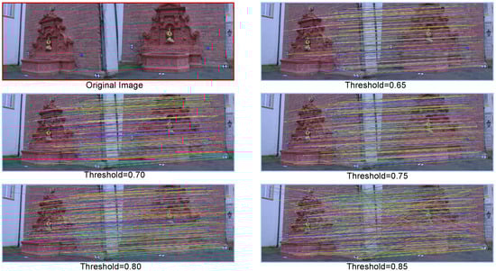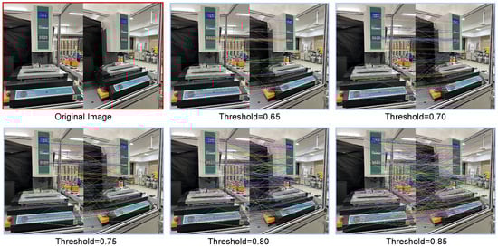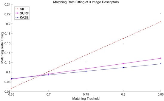 Equation (1) is the computational formula for the image pyramid before SIFT feature detection, where the Gaussian scale space L is first constructed by continuously varying the scale by Gaussian kernel function convolving with the image I, denotes the Gaussian scale space, and is the differential Gaussian image. The differential Gaussian (DoG) response image is obtained by subtracting the images of two neighboring Gaussian spaces, and the location of feature points is detected by the DoG. A gradient histogram of the image is used to find the stable orientation of the feature points. Then, the SIFT feature point location, scale, and orientation information can be obtained. Speed-up robust features (SURF) [] and KAZE [] feature extraction are also used to compare with SIFT.