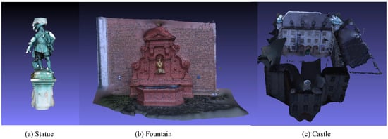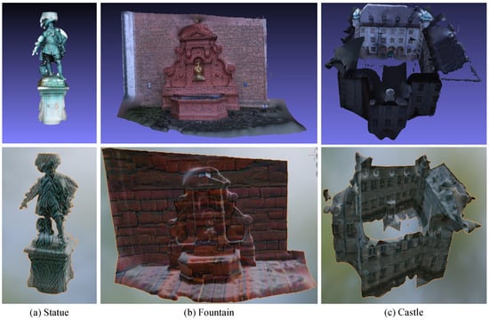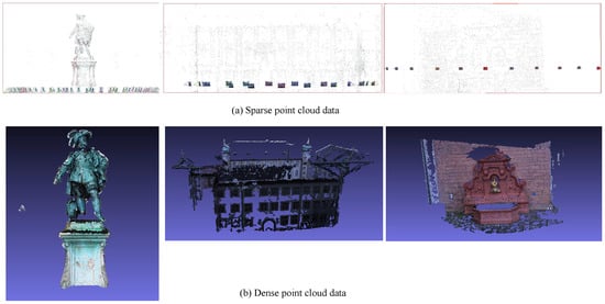 In this section, Section 4.1 encompasses feature point detection, feature point matching, feature point triangulation, and point cloud generation, using the structure-from-motion algorithm to obtain the point cloud. Section 4.2 presents the surface reconstruction results based on the point cloud data, producing a mesh model composed of triangular facets. Section 4.3 demonstrates the results of the deep-learning-based texture mapping enhancement method. In Section 4.4, the experimental results of the reconstruction model, which integrated texture-enhanced mapping with the mesh model, are exhibited and compared with models generated using the LiDAR-based method. The experiments were conducted in a 64-bit Windows environment, using the Pycharm compilation environment and the Computer Vision toolbox in MATLAB2024a.
