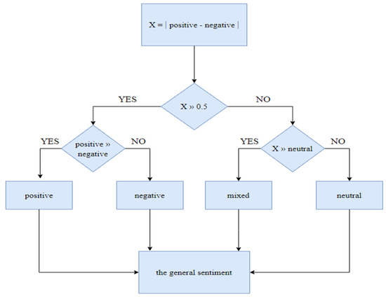 Following the analysis of the obtained results, a rule was observed for selecting the dominant general sentiment of the review. This rule is essentially a calculation based on the result of subtracting the confidence score values for “Positive” and “Negative” sentiments. Two cases are possible after obtaining this result: if the result is greater than 0.5, then the sentiment is one of the two, “Positive” or “Negative”, with the one having the highest score being chosen; otherwise, if the absolute value of the difference is less than 0,5 or equal with 0.5, the resulting sentiment could be “Mixed” or “Neutral”, and will be chosen sentiment “Neutral” if this one has a higher score than the previous result, otherwise, the overall sentiment will be “Mixed”. This is also illustrated in the diagram from Figure 1.