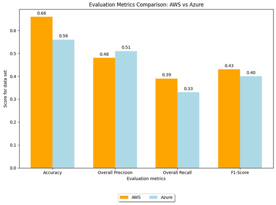 Figure 4 shows the values for each metric in the case of both solutions, in the one based on the results obtained following the analysis with Amazon Web Services, as well as in the second one when results were obtained following the analysis using Microsoft Azure. Thus, for the Azure AI-Language Text solution offered by Microsoft Azure, the following values were obtained: “Accuracy” is 0.56, “Overall Precision” is 0.51, “Overall Recall” is 0.33 and the “F1 Score” is 0.40. In the case of the Amazon Comprehend solution offered by Amazon Web Services, the values obtained are as follows: “Accuracy” is 0.66, “Overall Precision” is 0.48, “Overall Recall” is 0.39 and the “F1 Score” is 0.43.