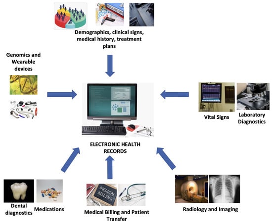 Moreover, there is also a need for other types of data capture that can help reduce basic errors and provide real-time feedback to ensure the collection of accurate and complete information []. Dental EHRs are also useful for clinical decision support systems that can provide real-time patient-centered recommendations in clinical settings as well as in education to monitor students’ activities for didactic training and clinical practice [,]. Levitin et al. [] discuss the issue of incompleteness in electronic dental records and attempt to identify specific details associated with this problem. Their findings reveal that the issue of completeness is prevalent in dental records, similar to regular electronic records. In a related study, Simon et al. [] emphasize the importance of interoperability in electronic dental records and provide a comprehensive analysis demonstrating the interconnectedness of dental records with allergies and general health records. This observation underscores the significant link between dental and vision records with regular health records. For instance, Vu et al. [] exemplify this interconnectedness by linking dental records to the occurrence of type 2 diabetes.