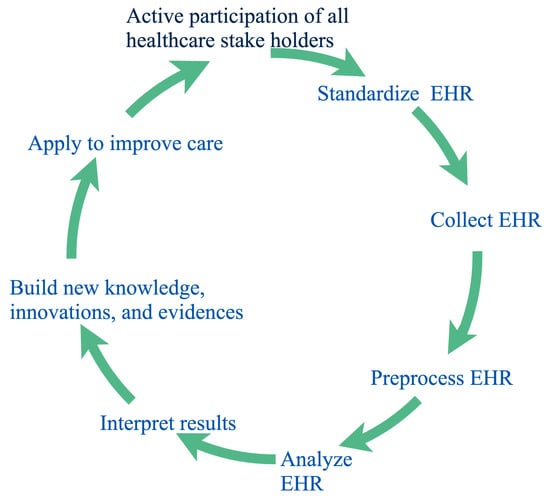 A recent review by Shah et al. [] highlights the role of EHR in Public Health Surveillance (PHS), which focuses on monitoring and controlling diseases that can impact large populations, such as epidemics and pandemics. EHRs enhance PHS by collecting and analyzing data on diseases and their risk factors, enabling more effective disease control and prevention. The authors note that EHRs, with their rich data, provide valuable insights for public health agencies, improving community health monitoring and automating surveillance processes. This proactive approach helps prevent outbreaks by identifying high-risk cases early, rather than just reacting to them. More generally, EHR may help monitor trends in chronic health conditions such as diabetes and obesity. A better understanding of what health conditions have greater prevalence may help public health practitioners focus their efforts on these specific conditions.