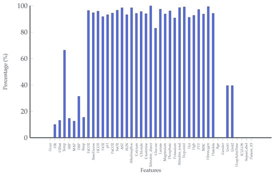 Furthermore, missing data within the available EHRs significantly contribute to data incompleteness, which negatively impacts the healthcare ecosystem. Figure 5 presents an example from the eICU research database [], highlighting the extent of missing values across various features. In this specific instance, 28 out of the 43 features analyzed have more than 50% missing values. The absence of critical information can create gaps in patient records, hindering the ability to make comprehensive and informed clinical decisions. This disorganization can disrupt the continuity of care, as healthcare providers may lack essential data needed for accurate diagnosis, treatment planning, and the monitoring of patient progress.