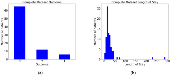 (a) Complete dataset distribution on outcome output, where patients with value 0 have been dismissed, with value 1 are deceased without being in intensive care unit, with value 2 are deceased after being in intensive care unit. (b) Complete dataset distribution on LOS output.