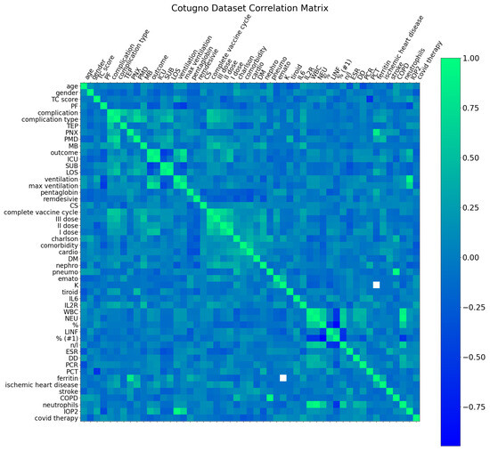 Following pre-processing and merging of the datasets, the correlation matrices for the Vanvitelli, Cotugno, and Complete datasets are shown in Figure 6, Figure 7 and Figure 8, respectively. In these matrices, cells colored green represent strong positive correlations between feature pairs, while blue cells indicate negative correlations, meaning the features are still correlated but in an inverse manner. By identifying feature pairs at both extremes—highly correlated and highly anti-correlated—the dataset can be further filtered for model optimization.