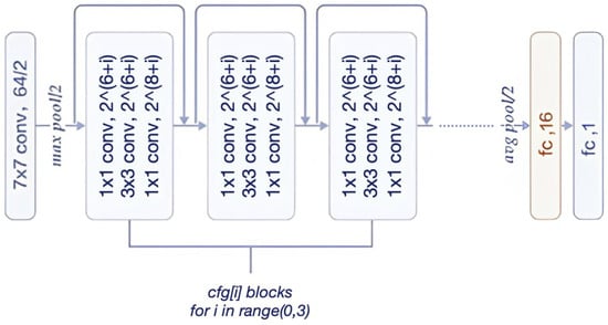 Since there were no chances of expanding the dataset with new patients to improve model performances, the focus moved towards the implementation of a machine learning model exploiting pre-trained CNNs as feature extractors for the chest CT scan. In order to accomplish this new task, depending on the original input adopted, which could be either the single slide with the greatest number of non-zero pixels or the whole 3D CT scan, a 2D and a 3D version of ResNet50 were chosen. In particular, the 2D version had pre-trained weights from ImageNet, while the 3D version had pre-trained weights from MedicalNet [27]. Both models were modified with the addition of an extra fully connected layer placed before the output layer, which is useful to fix the number of outputs representing the desired features obtained from a given input scan. A representation of this procedure on the original ResNet50 architecture is shown in Figure 11. These models were fine-tuned for 80 epochs (which resulted in the best amount before resulting in overfitting) and then adopted as feature extractors, thanks to the added fully connected layer. In both cases, the extra fully connected layer has an output vector of length 16, meaning that 16 “features” can be extracted from both single slices and CT volumes. Given these two sets, for each patient of every dataset, there are