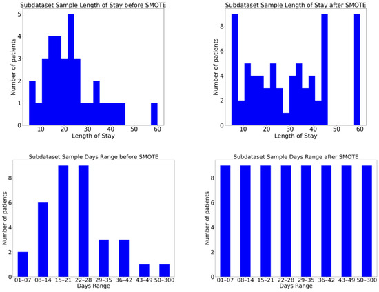 Distributions of a subset sample over days range and LOS before and after applying SMOTE on days range.