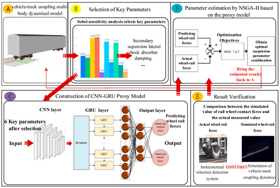 To achieve the accurate estimation of suspension parameters for heavy-duty freight trains, this paper utilizes actual values of wheel–rail force measurements from heavy-duty freight trains, constructs a proxy model based on CNN-GRU, and combines sensitivity analysis and an optimization algorithm. Figure 1 depicts the overall procedure, and the primary contributions of the method are as follows: