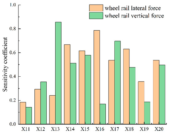 (2) The Sobol global sensitivity analysis method was used [22,23] to assess how input parameters affect the model’s output. It can assess the impact of the input dynamical parameters on the variation of wheel–track forces. Based on the values of 10 suspension parameters sampled using the Latin hypercube method and the corresponding forces acting vertically and laterally on the wheels and rails, the global sensitivity coefficients of parameters X11–X20 to wheel–rail forces were calculated, and the sensitivity analysis results are shown in Figure 2.