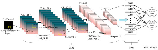With the advancement of deep learning technologies, neural network models are widely used in various fields, showing great performance, especially in processing time-series data. As a feedforward neural network, the Convolutional Neural Network [24] is particularly suitable for image recognition and signal processing tasks. It captures the spatial structural characteristics of input data through local connections and weight sharing mechanisms. CNN can be used to extract spatiotemporal characteristics of the vehicle movement data, for instance, wheel–track interaction forces, acceleration values, and other time-varying patterns of signals. The GRU (gated recurrent unit) [25] is derived from the LSTM network. It has a simplified LSTM structure while maintaining a capacity for handling long-range dependence. The GRU regulates the flow of information by creating update and reset gates, allowing the network to better remember past information and ignore irrelevant information.