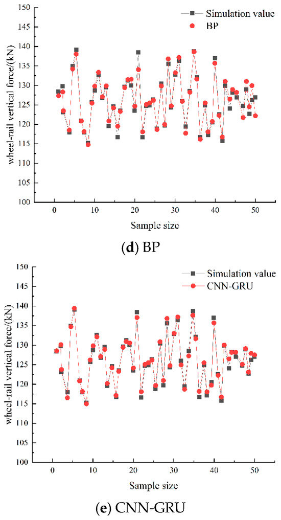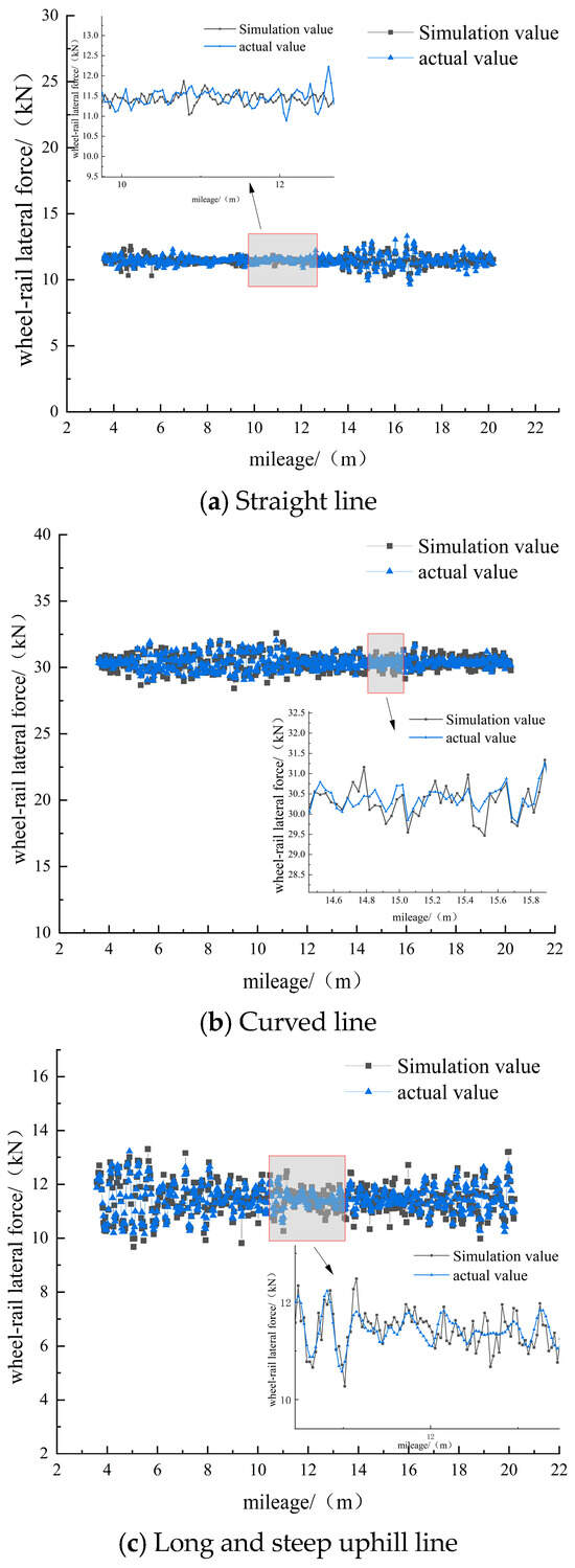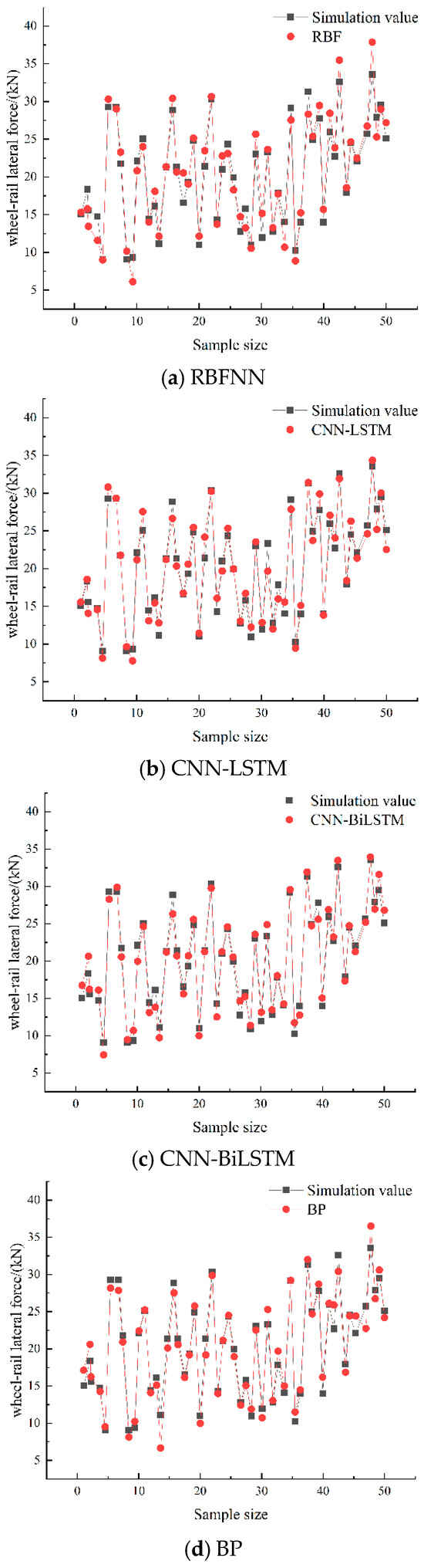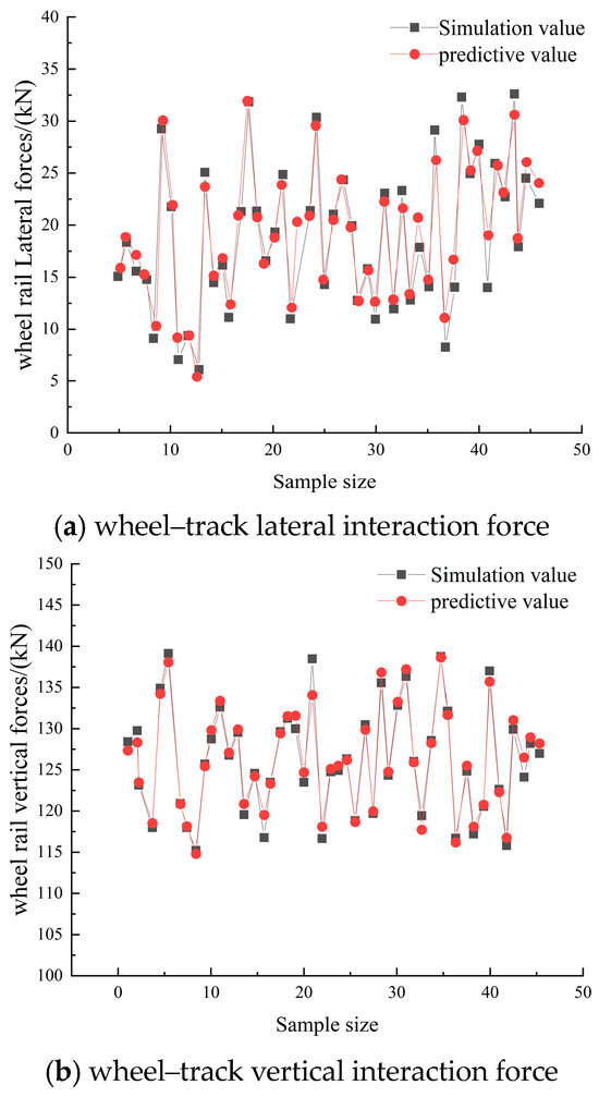 - The forecast output values of wheel–track interaction forces were compared with the simulated values to validate the model’s accuracy. The outcomes are depicted in Figure 4.