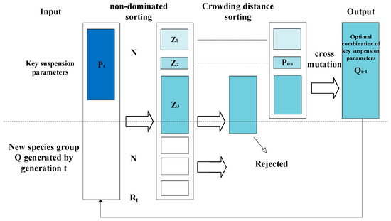 Compared with traditional genetic algorithms, NSGA-II (Non-dominated Sorting Genetic Algorithm II) [26,27] adopts the concepts of fast non-dominated sorting and crowding. This significantly increases the rate at which iterations converge, significantly lowers computational complexity, and guarantees population variety so that the optimal solution set can be found among multiple and conflicting objectives. With certain constraints, NSGA-II can find the best combination of suspension parameters. Its principle is illustrated in Figure 6.