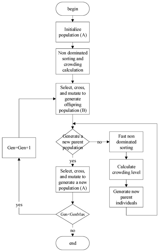 The core idea of NSGA-II is to perform non-dominant sorting on the population and select excellent individuals for genetic operation according to the sorting results and crowding information. First, an initial population Pt is randomly generated. It contains a certain number of individuals. Each one represents a possible solution consisting of a set of decision variables, ranked in a non-dominated fashion according to the individual’s objective function value. The non-dominant hierarchy defines the criteria for one individual to be better than another, i.e., an individual is better than another if it outperforms the other in all goal functions. Through non-dominated sorting, the population can be divided into multiple frontiers (F1, F2, F3, …). For each individual on the frontier, the crowding distance between them is computed. This facilitates the consideration of diversity and distribution when selecting new population members. A new candidate population Qt is generated through hybridization and mutation operations. The original population and the newly generated candidate population are then merged. By comparing the non-dominated level and crowding distance of individuals in the two populations, the highest-performing individuals are selected to be part of the next population. The algorithm’s flow is illustrated in Figure 7.