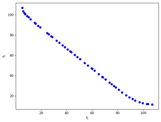 After the optimization calculation, Figure 9 shows the Pareto front of NSGA-II. Table 3 and Table 4 provide some information about NSGA-II during operation, where the first column represents the current number of iterations, the second column represents the total number of evaluated individuals, the third column represents the number of non-dominated solutions, the fourth column represents the convergence index, and the fifth column represents the evaluation index. Ideal indicates that the current solution set is close to the ideal solution, f indicates that there is no significant change in the current solution set, and nadir indicates that the current solution set is closest to the worst solution. In the later stage of optimization, a smaller EPS value indicates that the solution set is close to the optimal solution. The indicator is mainly f, indicating that the solution set tends to be stable.
