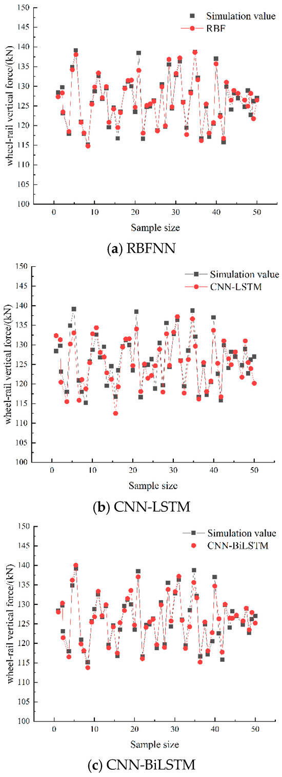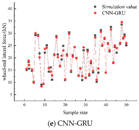 As shown above, for wheel–track lateral interaction force, the RBF model has the highest relative error rate of 10.09%, whereas this value in the other models is relatively low, and the method proposed in this research has the lowest relative error ratio of 3.59%. For the values of wheel–track vertical interaction force, the numerical fluctuation is small, and the relative error rate of incidence of the proposed method is minimal, at 1.56%. In other words, the CNN-GRU model described in this paper can provide better forecasting accuracy.