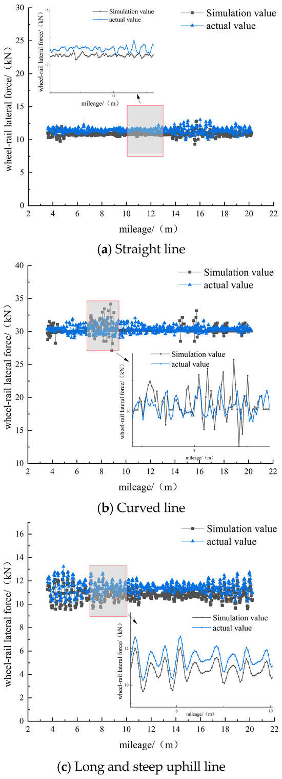 The statistics in Table 8 and Table 9 show that, under different working conditions, the error produced in simulating wheel–rail force is significantly improved after using the estimated suspension parameters, i.e., after the suspension parameters are corrected. Specifically, the error rate of the wheel–track lateral interaction force decreases from 9.28% to 7.00%, while the error of wheel–track vertical interaction force increases slightly from 0.93% to 1.17% under the straight-line condition. Under the curved-line condition, the error rate of wheel–track lateral interaction force decreases from 6.24% to 4.52%, and from 2.47% to 2.02% for the vertical force. Under the long and steep uphill conditions, the error rate of wheel–track lateral interaction force decreases greatly from 18.11% to 10.44%, and from 2.01% to 0.85% for the wheel–track vertical interaction force. These results show that the error between the simulated and real-world values of the wheel–track interaction force is significantly reduced by suspension parameter correction, especially under complex working conditions (such as curved line and long and steep uphill line). This fully demonstrates the efficacy of the strategy provided in this study in improving the accuracy of the simulation model and the operational safety of the train.