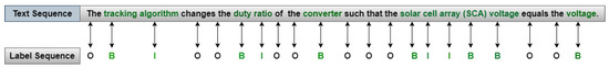 Sequence labeling captures long-term semantic dependencies within a document and identifies the correct labels for keywords by utilizing the entire document’s information [4,25]. As shown in Figure 1, the sequence labeling model processes the input text, assigns labels to each token, and produces an annotated sequencing that accurately reflects the keywords within the document.