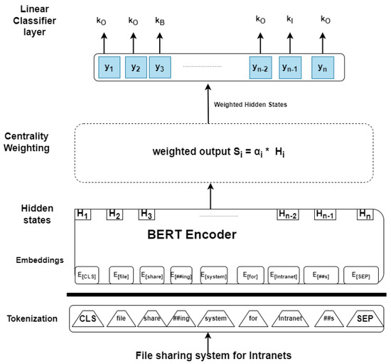 We applied a linear classification layer to the hidden states produced by the BERT model (see top layer of Figure 2), that is, the hidden states that were concatenated with the cosine similarity measure between the document embedding and the word embedding. This concatenation step integrates the centrality information directly into the token representation, thereby enhancing the model’s focus on tokens that are more central to the document’s content. Specifically, for each token , the hidden state from BERT is concatenated with the cosine similarity , which measures the similarity between the document embedding C and the word embedding . The resulting vector is then passed through a linear layer followed by a softmax function [31,32].