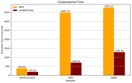 The graph in Figure 4 shows the computational time of the CenBERT-SEQ and BERT-based models on the three datasets. The graph shows that the CenBERT-SEQ was faster in terms of training time compared to the standard BERT on all three datasets. With CenBERT-SEQ taking s, BERT takes s when evaluated on the SemEval-2010 dataset. When evaluated on KDD, CenBERT-SEQ took s to train while BERT took 3485.76 s. Lastly, on the WWW dataset, the computational training time for CenBERT-SEQ was s while that of BERT was s. The graph shows that, for both models, there was less training time on the SemEval-2010 dataset, although BERT-base took double the amount of training time compared to that of the CenBERT-SEQ model.