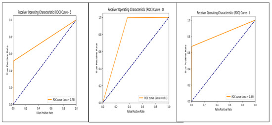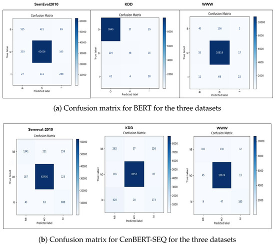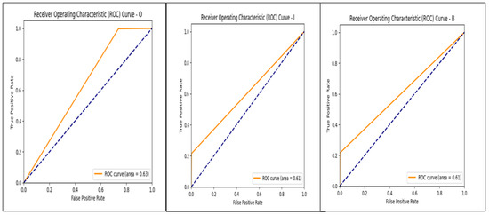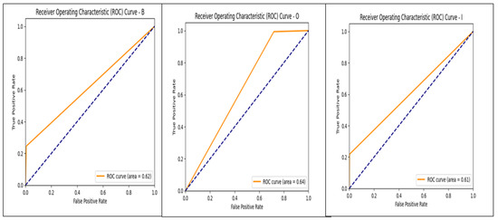Figure 6 depicts the ROC curves of the performance of the proposed CenBERT-SEQ model on the KDD dataset with that area under the curve (AUC) values of 0.63, 0.61, and 0.61, for the classes B, O, and I, respectively. These AUC values indicate that the CenBERT-SEQ model performed slightly better on the KDD dataset when detecting the beginning of keyphrases as compared to the detection of tokens inside and outside the keyphrases, as shown by the slightly higher AUC for the class B. The classes O and I have a similar AUC of , showing that the model’s ability to classify tokens as outside a keyphrase (class O) and inside a keyphrase (class I) is comparable.