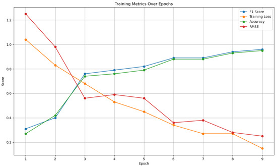 We conducted experiments to evaluate the term extraction models on standard benchmark datasets. The charts of accuracy, F1-score training loss, and root mean square error (RMSE) for the proposed CenBERT-SEQ model and BERT base-uncased during training are presented in Figure 8 and Figure 9. The curves in Figure 8 show that, as we increased the number of epochs, the RMSE and the training loss decreased, the RMSE reduced from 1.25 to 0.25 over nine epochs, while the training loss reduced from 1.04 to 0.15. This shows that the model’s performance improved as the number of training epochs increased, allowing the model to also learn how to extract keyphrases from more data. Also, the decrease in RMSE indicates that the model’s predictions became more accurate as training progressed. Figure 8 also showed that, as the number of epochs increase, the accuracy and F1-score increased, showing that the proposed CenBERT-SEQ model is correctly predicting a higher percentage of instances as it continues to learn and the predictions are becoming more reliable. Figure 9 presents the performance for the BERT base-uncased which was trained over five epochs. The accuracy was constant throughout the training, while F1-score slightly decreased by 3%; however, the results show that the model was performing well.