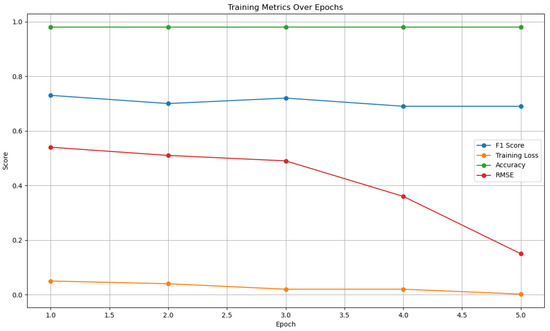 The F1-score is a harmonic mean of precision and recall, making it a robust metric for evaluating model performance. However, it may not fully capture the quality of predictions in highly imbalanced datasets where one class dominates [37,38]. For example, in our case, the class is dominating, therefore we would also want to consider Matthews correlation coefficient (MCC), computed as shown in Equation (14). This metric considers true positives (TPs), true negatives (TNs), false positives (FPs), and false negatives (FNs) [37,38] in order to provide a more balanced evaluation of model performance across all classes.