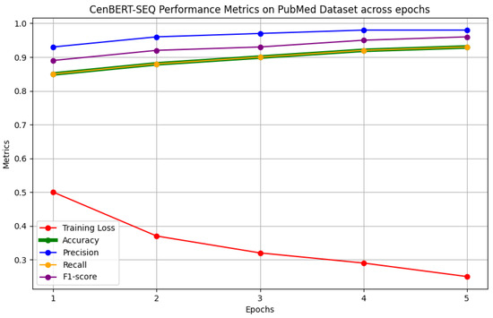 We used the same preprocessing techniques, including tokenization and sequence labeling, as in the earlier experiments. The model was trained with the same hyperparameters. Figure 13 presents the performance metrics (precision, recall, F1-score) of our proposed CenBERT-SEQ on the PubMed dataset. It is shown in Figure 13 that the training loss starts at at the first epoch, decreasing to at the fifth epoch, while accuracy, precision, recall, and F1-score range between and . The accuracy curve is obscured by the recall curve since they have similar metric values, thus causing overlapping. The results indicate that CenBERT-SEQ maintains strong performance in the biomedical domain, suggesting that the centrality-weighting layer of the CenBERT-SEQ model may contribute to its robustness across different domains.