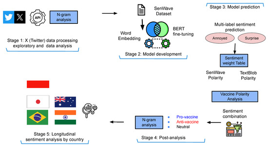 Figure 1 presents the framework for detecting anti-vaccine tweets using sentiment analysis, showing the major stages. In Stage 1, we first implement tweet extraction and the pre-processing of tweets based on keywords related to vaccination. We then provide exploratory data analysis such as finding vaccine-related tweets in COVID-19-related tweets over a selected time frame, along with bigram and trigram analysis. In Stage 2, we implement word embedding using the BERT model and apply refinement (fine-tuning) using the SenWave data for multi-label sentiment classification, i.e., a tweet can be labelled “optimistic” and “anxious”. In a multi-class classification task, all classes are mutually exclusive, and each instance can only be assigned one label, which is not the case for multi-label classification. Stage 3 features model prediction based on tweets from different countries. Once we obtain the tweet sentiment classified by the model, we make certain assumptions and devise a strategy to determine if the tweet is anti-vaccine, pro-vaccination, or neutral using a vaccine polarity score. We also compute the sentiment polarity score using a textual data processing library in Python known as TextBlob https://textblob.readthedocs.io/en/dev/ (last accessed on 8 December 2024). We assigned sentiment scores in Table 2, where a positive score indicates positive sentiment toward the statement, and a negative score indicates negative sentiment. We also provide a rescaled value in a range [−1,1] and then assign weights to each sentiment to calculate our vaccine polarity score given two sentiment labels. Figure 2 presents the combination of the sentiment labels to calculate the vaccine polarity score, where we use the sentiment score (Table 2) for each sentiment. In Stage 4, we implement post-analysis to categorise sentiments into pro-vaccine, anti-vaccine and neutral vaccine tweets during COVID-19. We provide n-gram analysis for tweets in the major categories. Finally, in Stage 5, we provide longitudinal sentiment analysis by country to review sentiment changes given the major events during COVID-19.
