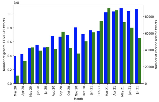 We first present data analysis for extracted tweets related to COVID-19. Figure 3 compares the volume of vaccine-related tweets and general COVID-19-related tweets at the beginning of the pandemic (March–July 2020). We notice fewer vaccine-related tweets during the beginning of the pandemic (March and April 2020), compared to the following months (May, June, and July 2020). Afterwards, there is a decline and then a rise in vaccine-related tweets. These trends align with the discussions by mainstream media, the vaccination rate, and related factors that give rise to such tweets.