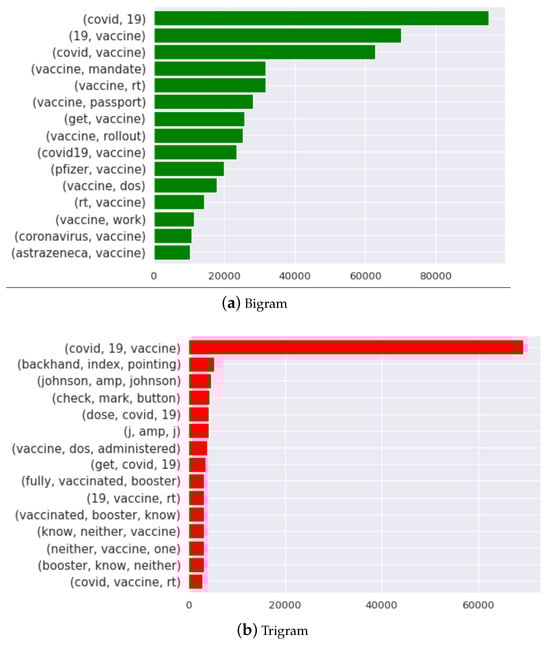 N-gram [78] analysis is a method frequently used in NLP to capture the interdependencies among sequences of words of length N in textual data. We conduct a word-level bigram and trigram analysis from March 2020 to July 2021 worldwide to find occurrences of consecutive words in the selected tweet dataset as shown in Figure 4. We observe that in the bi-grams, the phrase “covid19 vaccine” has the highest frequency of appearance, closely followed by “vaccine force” and “waning immunity”. In the trigrams, the three-worded phrase “fight covid19 smile” (the smiling emoji has been converted into the word “smile”) is most commonly used, followed by “covid19 positive test” and “positive antibody test”.