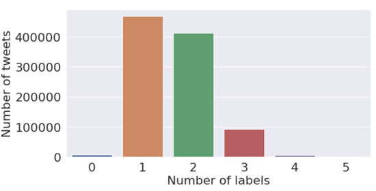 Finally, we present the longitudinal analysis of sentiments in COVID-19-related tweets over the period from March 2020 to February 2022 based on the 11 sentiment labels. Figure 5 gives an idea about how tweets are distributed according to their sentiments. From this plot, we can observe that 300,000 tweets correspond to the sentiment “official report”, followed by “annoyed” and “optimistic”. This shows the sentiments that have dominated among (x) Twitter (X) users during the COVID-19 pandemic. Figure 6 shows that more than 400,000 tweets correspond to only one sentiment, followed by only two sentiments.