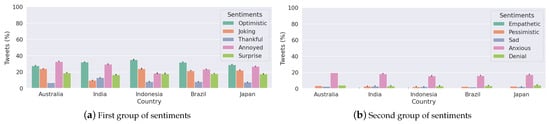 Figure 7 presents the box plot that shows that the median of polarity scores is very close to 0, or almost 0. By examining the interquartile ranges for each country, we can discuss any differences in the variability of polarity. A wider interquartile range suggests a greater variation in sentiment among Twitter users in that country, while a narrower range suggests a more consistent sentiment, as in the case of Australia. Figure A1 shows a violin plot of vaccine polarity scores for different countries that suggests the polarity density of tweets for different countries. Figure 8 presents the percentage of tweets belonging to sentiments for each country. We note that “optimistic”, “joking”, and “annoyed” are the most expressed sentiments (Panel (a)) along with anxiety (Panel (b)).