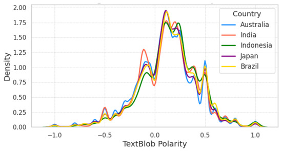 Figure 13 shows the Kernel Density Estimates (KDEs) [80] (distribution) of the TextBlob polarity score of different countries showing similar trends, with a noticeable difference for India in the polarity range between −0.2 and 0. Figure 6 presents the TextBlob polarity statistics, featuring mean and standard deviation (SD) over the entire span of the dataset (taken from Figure 9) including and excluding 0 polarity scores. We notice that the density plots show more positive than negative sentiment scores, and the variations across countries would be due to the changes in polarity across different periods as shown in Figure 9.