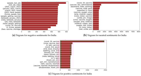 Next, we present the trigrams for sentiment polarity p based on TextBlob, where we group negative sentiments (), positive sentiments (), and neutral sentiments ( and ). Figure 14 and Figure 15 present the trigrams associated with the three groups of sentiments for the case of India and Australia, respectively. In the case of India (Figure 14), we find that negative sentiments are associated with “people, lost, job” and topics such as vaccine shortage, while the neural sentiments also relate to vaccines and other issues such as medical supply. The positive sentiments are associated with the COVID-19 vaccine, vaccine dosage, second wave, and Prime Minister Narendra Modi. There are certain topics (trigrams) that overlap negative and neutral sentiments and over the sentiments. The vaccine overlaps all three sentiment groups, which indicates that based on the context, groups of people expressed it as negative, positive and neutral. Table 4 presents the TextBlob polarity (mean and standard deviation) over the entire span of the dataset (taken from Figure 9) including and excluding 0 polarity scores. We note that 436,340 out of 1,187,390 tweets had 0 polarity for all five countries, which gives a high standard deviation and a skewed distribution.
