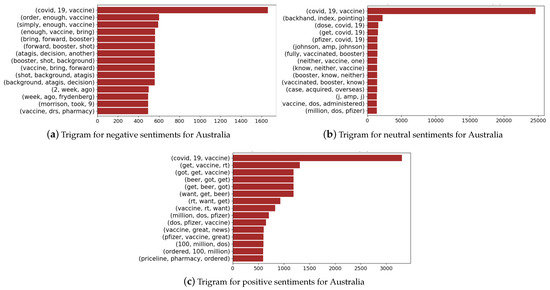 Figure 15 presents the trigrams for the case of Australia, where we find the vaccine as the most expressed trigram across the three sentiment groups. This is similar to India, and we also find that Prime Minister Scott Morrison is amongst the trigrams of the negative sentiment group, indicating that most tweets expressed negative sentiments about how the government managed the pandemic. The names of vaccine manufacturers, such as Pfizer and Johnson and Johnson, are among the neutral sentiments. We find trigrams associated with vaccines and their manufacturers, order numbers, etc., in the group of positive trigrams.