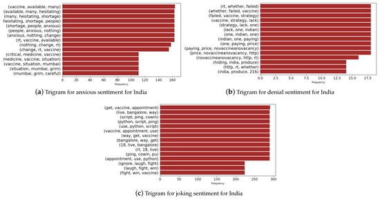 Finally, we present the trigrams for selected sentiments in the case of India and Australia in Figure 16 and Figure 17. We notice that the denial sentiments capture unique keywords that include “vaccines”, “security”, and “government” for the case of Australia. In the case of India, the keywords consist of “failed’, “strategy”, “price”, “whether”, and “produce”. These keywords capture the various topics in media during the vaccine rollout in both countries. In the anxious sentiment, we notice unique keywords that refer to “hepatitis”, “chickenpox”, “diphtheria”, “side effects”, and “vaccines” for Australia. In the case of India, we find unique keywords such as “shortage”, “anxious”, “medicine”, “grim”, and “vaccine” giving an overview of the discussion in media and events during the period.