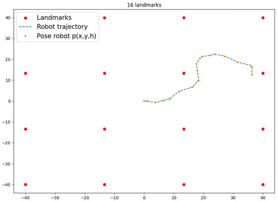 During each robot pose update, landmarks are measured from the surrounding environment. In this implementation, landmarks are distributed around each pose within an area of approximately 100 m, consistent with standard LIDAR configurations.