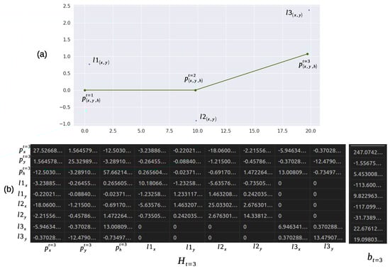 Information matrix at time step , showing the connections between the robot’s pose and the environmental landmarks. Panel (a) depicts the robot’s pose and the environmental landmarks, while panel (b) shows the information matrix (left) and the information vector (right).