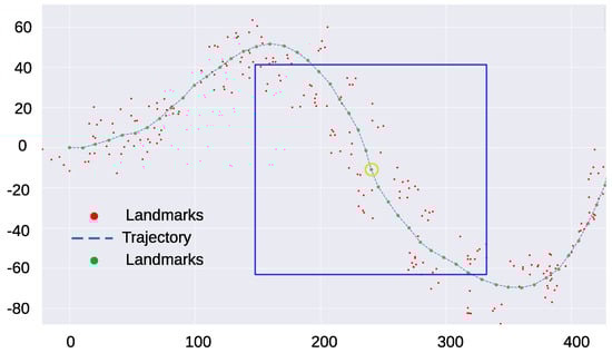 Figure 3 illustrates the sliding window (highlighted in blue) associated with a robot pose (indicated by a circle) at time t. As shown in Figure 3, the state consists of the current robot pose and the landmarks within the window (see Equation (3)).