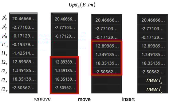 A simple example of updating the state vector with and . The red box highlights the items that are moved during the update.