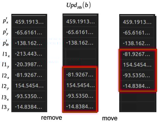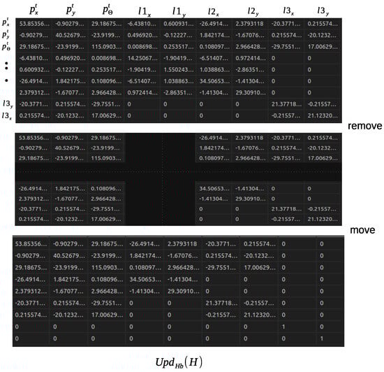 Note that until the number of robot steps reaches k (as defined in Equation (17)), no updating is performed. Once updating begins on H, b, and the state vector, the oldest block of landmarks of size is removed, and the remaining blocks are shifted to make room for the new landmark block. Figure 4, Figure 5 and Figure 6 illustrate the updating process for the state vector, vector b, and matrix H, respectively.
