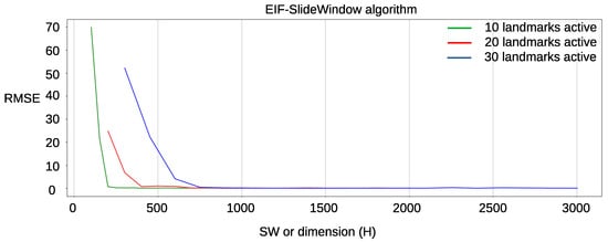 Our experimental results indicate a relationship among the number of active landmarks, the slide window size (which corresponds to the size of the information matrix H), and the RMSE (see Figure 9). It is evident that achieving a stable minimum RMSE while increasing the number of active landmarks necessitates a corresponding increase in .