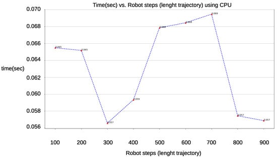 Finally, we highlight the advantages of utilizing a GPU. When using the CPU, the processing time increases exponentially after (see Figure 11, top). In contrast, the GPU exhibits a linear increase in processing time (see Figure 11, bottom). Specifically, we compute the average processing time (in seconds) for each robot pose in a trajectory, with fixed. According to Algorithm 1, this average time accounts for all iterations between lines 15 and 48, which correspond to a single trajectory.