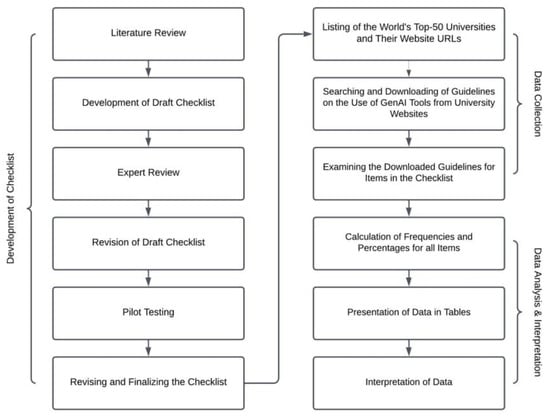 The study employed a quantitative method to examine the contents of the 50 universities’ GenAI guidelines against the 24-item criteria established in our developed checklist. These criteria can be grouped into three categories: (i) a general information category consisting of seven items, including guideline issuing authority, release or update date, and objectives and scope, among others; (ii) a category covering instructions on the use of GenAI tools under ten items covering issues such as recognizing situations where the use of AI tools is inappropriate, providing details about the GenAI tool(s) employed and the prompts used, and documenting the GenAI output(s) obtained, among others; and (iii) a category dedicated to ethical and legal issues and comprising seven items related to maintaining academic integrity and dealing with misconduct, safeguarding data privacy and security, and properly referencing and citing outputs generated by AI. Appendix A provides a full list of all items under each of the three categories. Figure 1 presents a flowchart illustrating the methodology employed in this study.