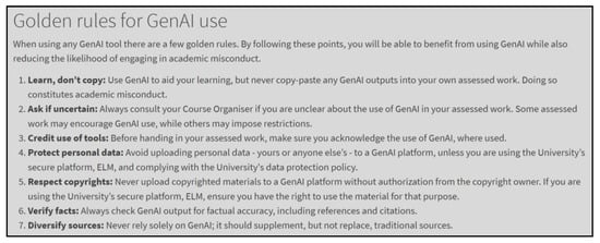 - The University of Edinburgh. Guidance for Working with Generative AI (“GenAI”) in Your Studies; The University of Edinburgh: Edinburgh, Scotland, UK, 2024; Available online: https://information-services.ed.ac.uk/computing/comms-and-collab/elm/guidance-for-working-with-generative-ai (accessed on 12 November 2024).