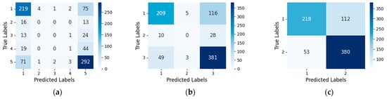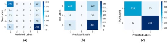 Visualization of the confusion matrices for predicting five, three, and two ratings using augmented data from JMCS. (a) Classification of five ratings; (b) Classification of three ratings; (c) Classification of two ratings.