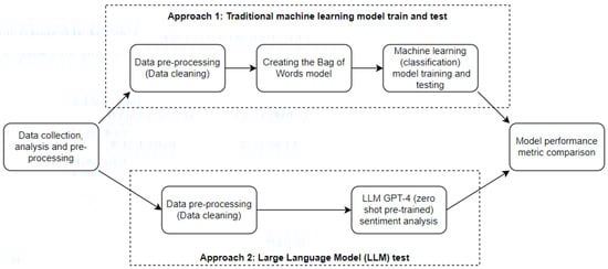 The following subsections outline two different methodologies for sentiment analysis. The first relates to the traditional approach of training and testing machine learning models. The second, which is gaining popularity, involves the use of pre-trained LLMs that can be directly applied to sentiment analysis tasks.