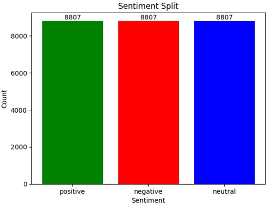 As is evident in Figure 5, neutral sentiments had the lowest record count, i.e., 8807; hence, the same number of records was taken for other sentiments, i.e., positive and negative, so that there was no data bias. The record counts are shown in Figure 5 after removing data bias.