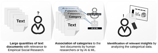 Global data quantity is growing rapidly [1,2]: growing populations, increasing usage of digital devices [2], and internet services [1] lead to huge quantities of data and opportunities for science and almost all industries. Analyzing these data can help improve efficiency by supporting human users or creating new business models. Empirical social science is one domain that benefits from more and more available data. The growing relevance of social media [1,2] enables researchers to assess human behavior and developments on a large scale. The vast quantities of data must be transformed in a processable way to exploit this potential. Qualitative content analysis enables social researchers to do that: it is a “very systematic way of making sense of the large amount of material that would invariably emerge in the process of doing qualitative research” [3].